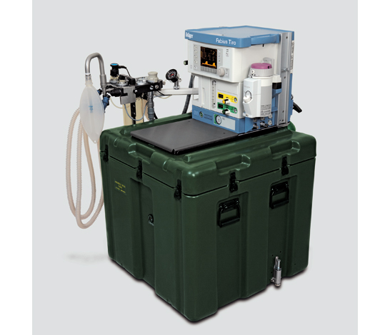 The modular design allows all standard system components to be stored in a single container so that assembly and disassembly of the unit is easily accomplished. Functionality and user interface are identical with currently marketed Dräger Fabius family anaesthesia machines used in high-acuity civilian operating rooms.